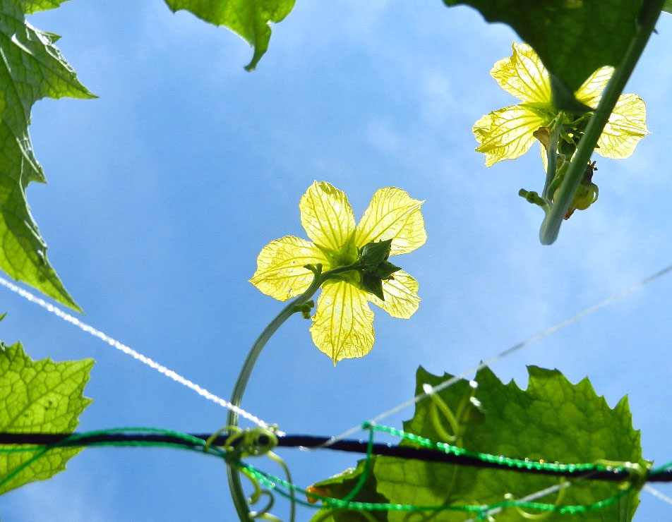 この写真からも明らかなように、ヘチマの花は、いくつも一緒になって花を咲かせるようであり、その黄色い清楚な花びらの下には、数個の蕾ができています。