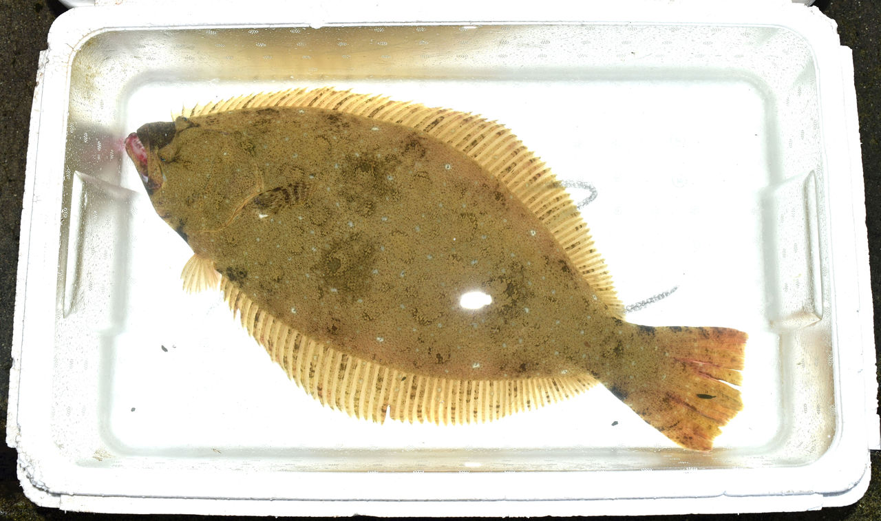 安岐港の市場で競りに出された立派な生きたヒラメ