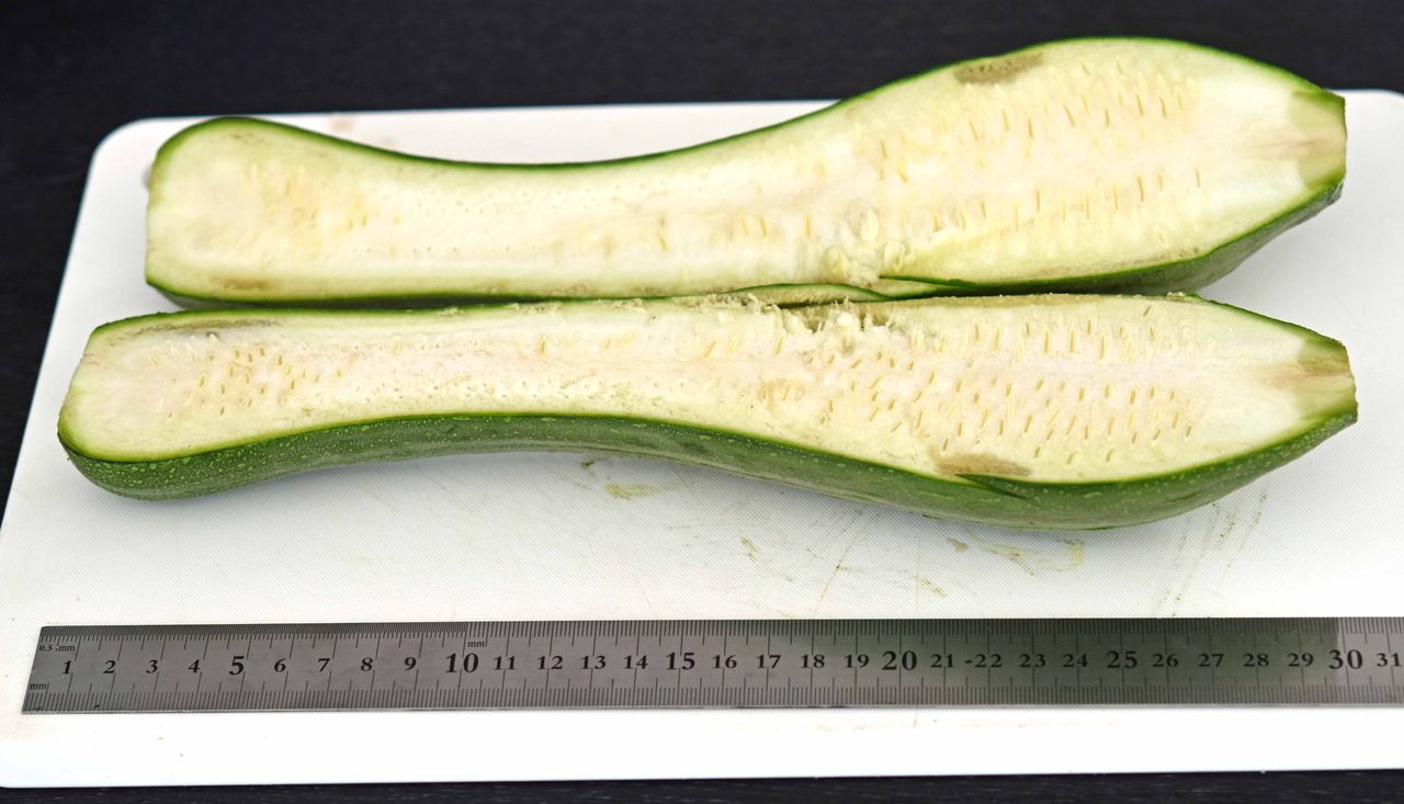 「ヘチマを料理できるようなので、今収穫したものを2つに切ってみましょう。包丁で縦に切れるかな?」