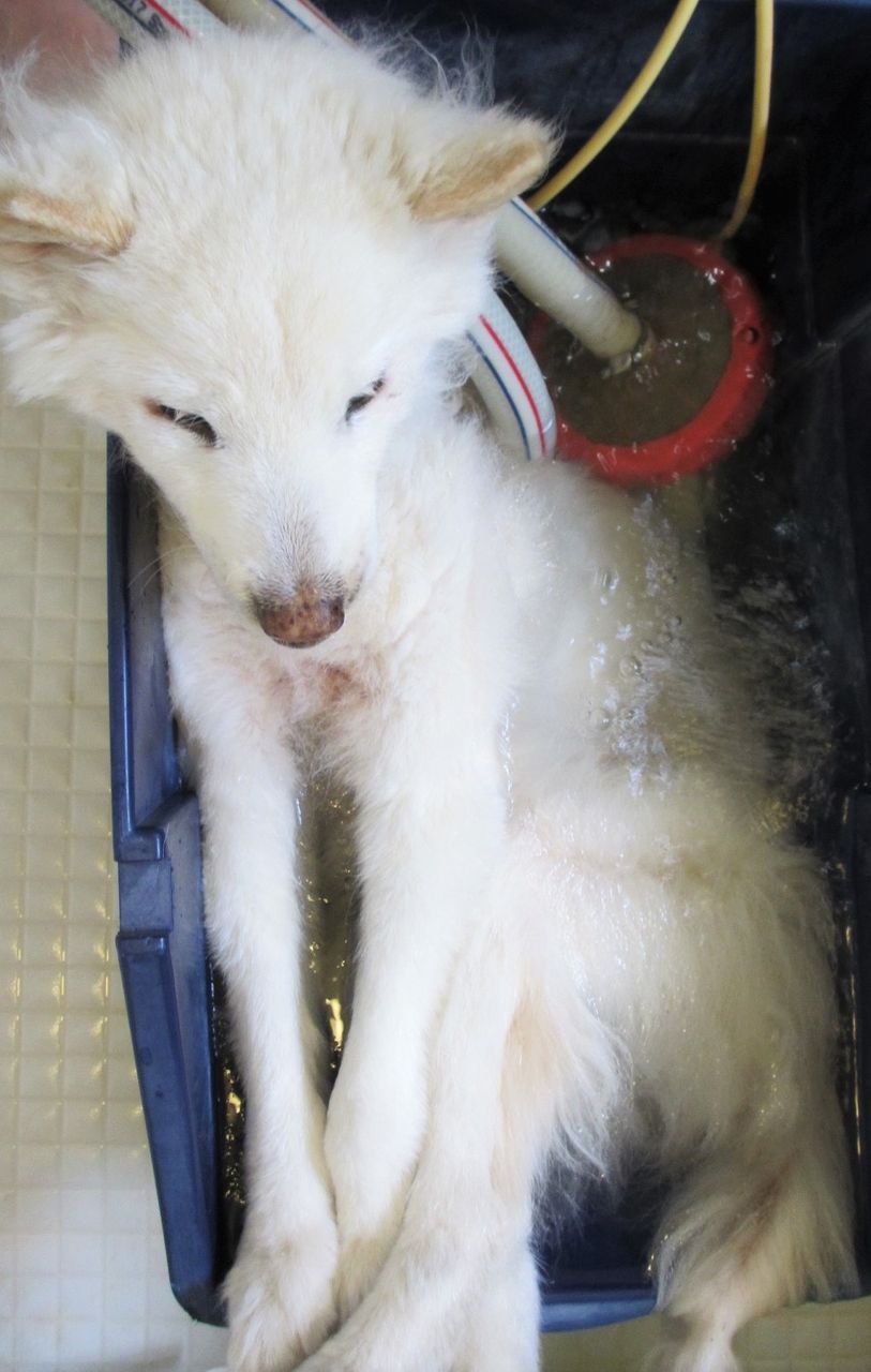 ヘルニアが悪化し、後ろ足がまったく曲がらず、歩けなくなり、排泄もできなくなって、死を待つしかないという深刻な状況に陥っていたなかで、最後の命綱としてのマイクロバブル入浴がなされました。