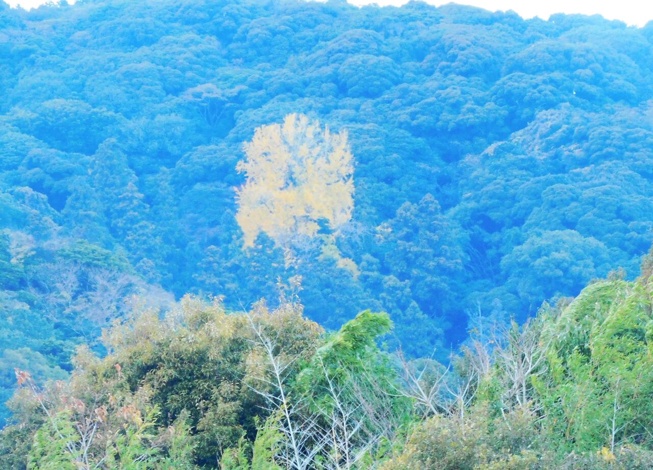 裏手にある小城山の森の中に一際彩鮮やかな広葉樹(銀杏かも)の風景です。
